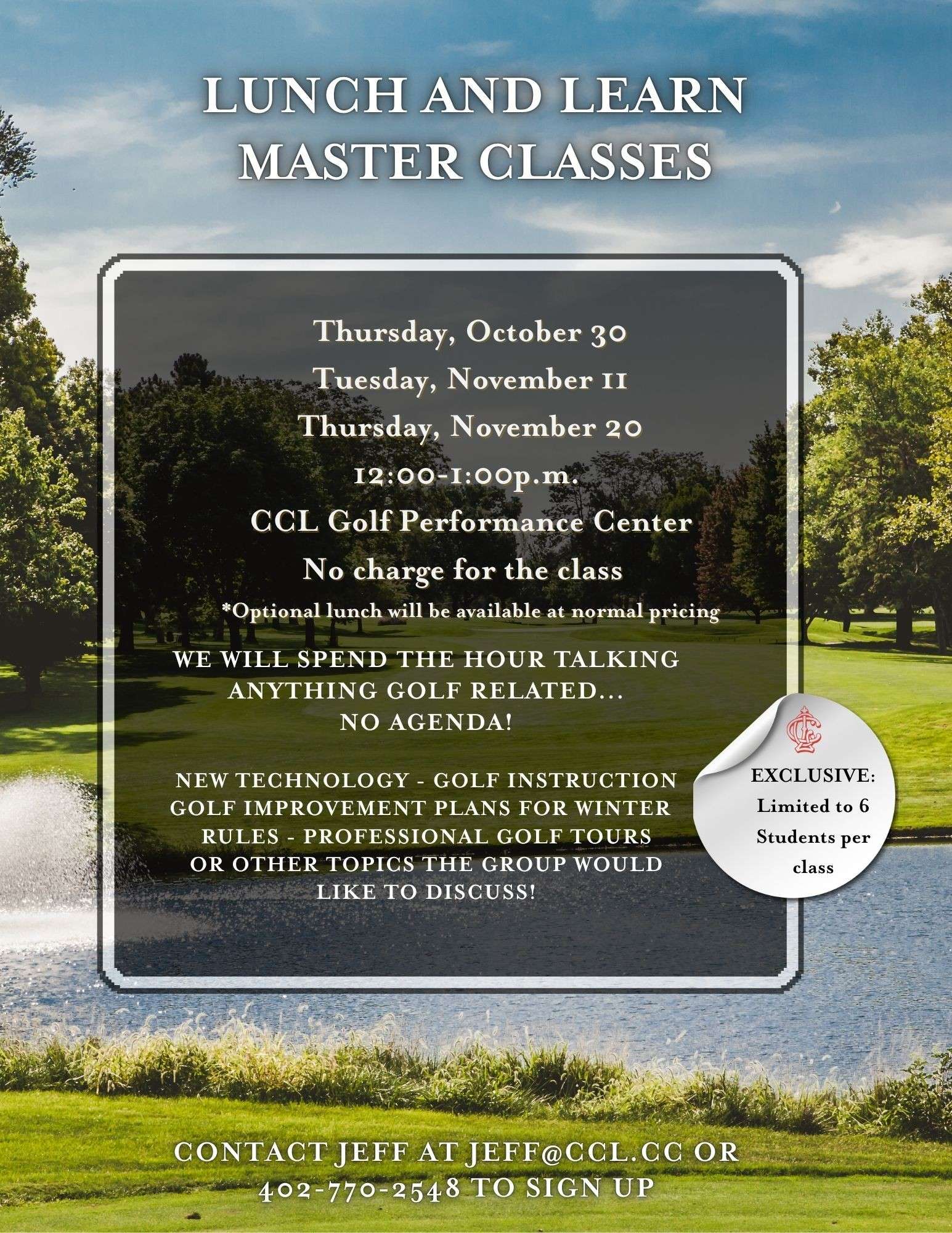 Join Jeff on of the pictured dates and times. He will spent and hour discussing ANYTHING GOLF! Contact Jeff at jeff@ccl.cc today to signup either by yourself or with a group of friends. Who doesn't like to talk GOLF?!